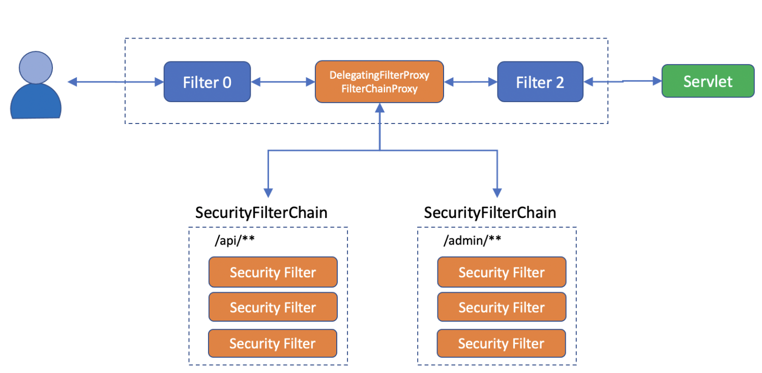 필터를 생성하며 확인할 것이지만 스프링 시큐리티는 DelegatingFilterProxy 로 오는 요청 URL 을 통해서 어떤 SecurityFilterChain 을 사용할지 결정을 합니다.