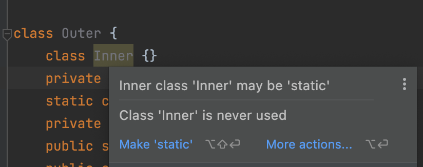 Intellij 를 포함한 다수의 IDE 에서는 내부 클래스를 중첩 클래스로 바꾸어 사용할 것을 권장하고 있습니다.