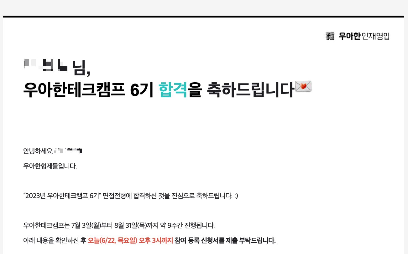 우아한테크캠프와 함께 네이버 채용 또한 함께 진행하고 있어서 그런지 결과 발표가 굉장히 빠르게 나오는 듯한 느낌이 들었다. (참고로 네이버는 한 단계마다 결과를 받는데 3~4 주의 시간이 걸렸다)
