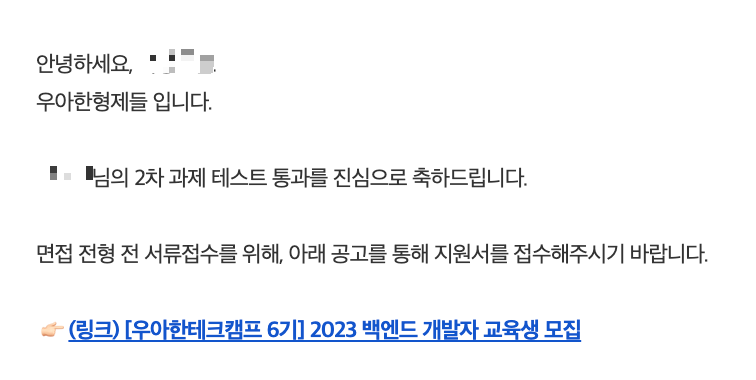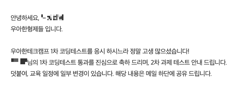 2차 과제 테스트는 좋지 않은 상황에서 봤기 때문에 개인적으로 불만족스러웠고 큰 기대를 하지 않았다. 하지만 정말 다행히도 합격 메일을 받을 수 있었고 아직도 합격 기준은 잘 모르겠다.