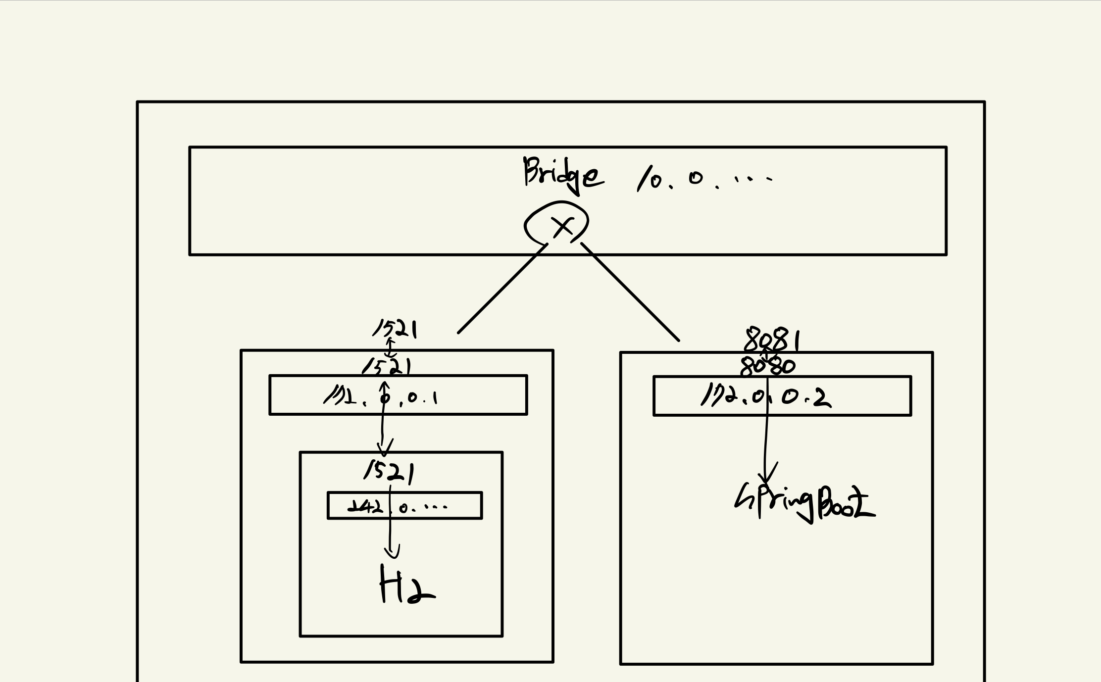 실제로 H2 를 구동시 또 자체적인 내부 IP 를 할당받아 호스트 머신과 포트포워딩 관계를 이루는 것을 확인하였고, 그래서 SpringBoot 보다 한 뎁스 더 낮게 표현했다.